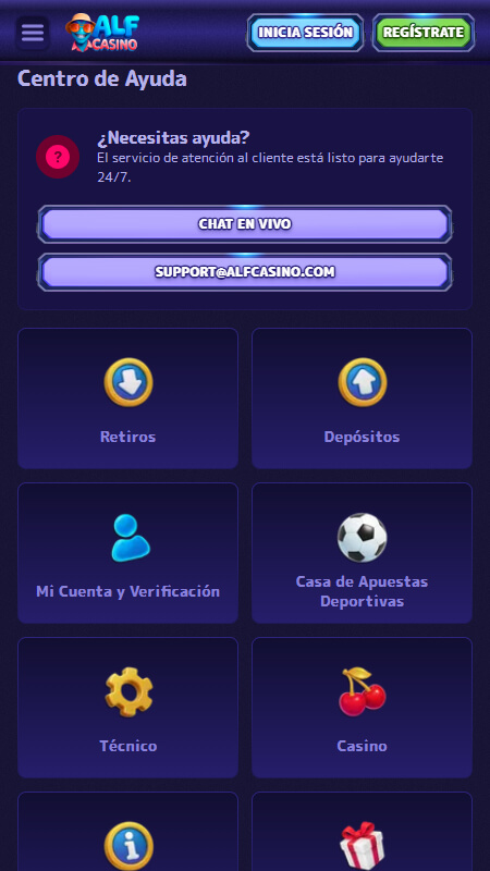 Correo electrónico (support@alfcasino.com) y chat en vivo