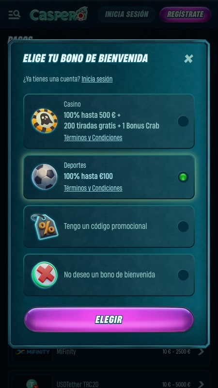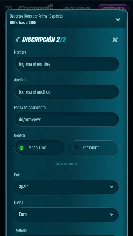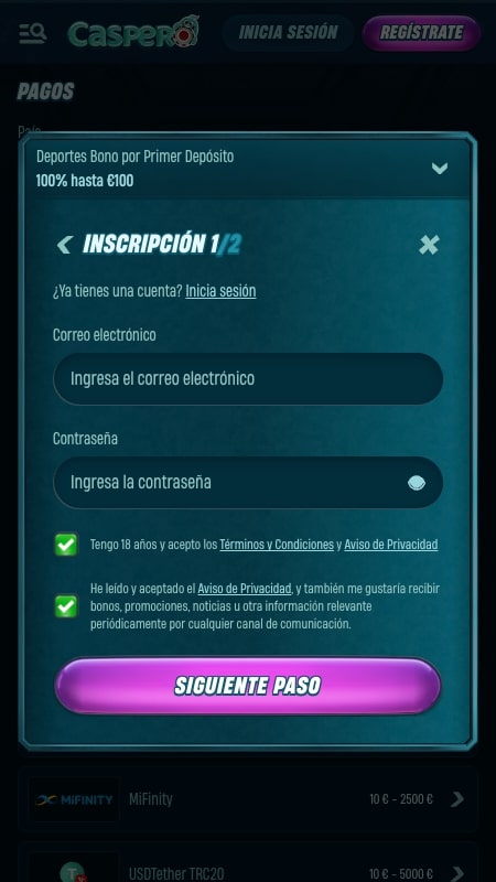 El proceso de registro no es demasiado exhaustivo y no te requerirá mostrar documentación, algo que, en ocasiones, se confunde con falta de seguridad. Has de saber, no obstante, que Caspero Casa de Apuestas es un operador confiable y estricto, y no permite el acceso a menores de edad.