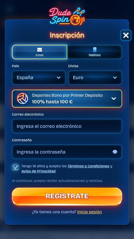 Accede a la página de Dudespin Casa de Apuestas con el enlace que te hemos dado. Luego, busca el botón “Regístrate”, que está en la esquina superior derecha.