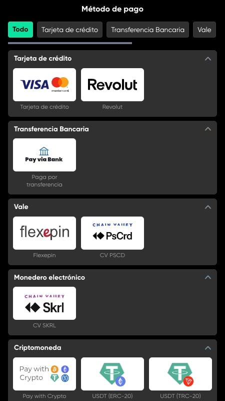 Como podemos ver, la cantidad de opciones es bastante aceptable. Es cierto que no dispondremos de algunas de las más populares en España, como PayPal o Bizum, pero al menos sí podremos decantarnos por el uso de Skrill y, además, podremos recurrir a vales como PaySafecard. En cuanto a las criptomonedas, tendremos una gran variedad donde elegir, y todas serán muy accesibles.