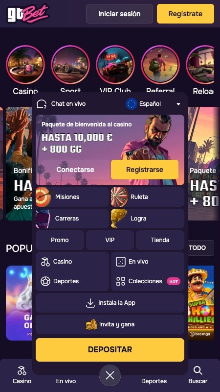 Hoy en día son muchos quienes prefieren jugar a través de un dispositivo. Y, por ese preciso motivo, GtBet nos permite descargar e instalar una aplicación que nos servirá para jugar desde el móvil. Esta opción aparece en el mismo menú principal de la web y, como no podía ser de otro modo, nosotros hemos querido probarla.