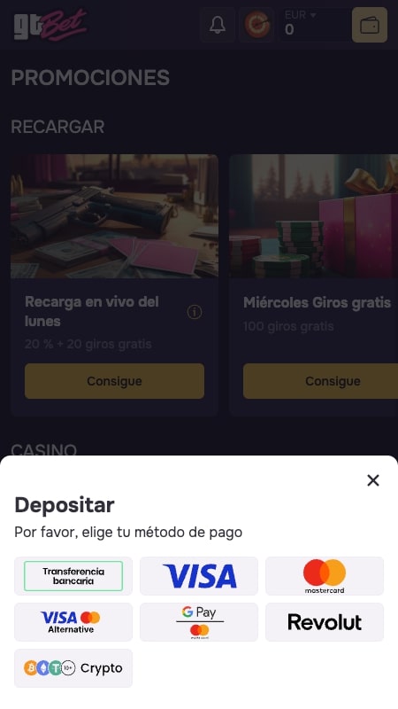 Habrás notado la ausencia de algunos de los monederos electrónicos más conocidos y populares. No solo hablamos de PayPal o Bizum, dos métodos de pago muy empleados en España. Y es que tampoco dispondremos de opciones tan populares en el mundo de las casas de apuestas como Neteller o Skrill. Igualmente, sí que dispondremos de GPay, de todas las opciones bancarias habituales y de una lista larga de criptomonedas. Queda claro, al ver los métodos de pago, que es en el apartado cripto donde GtBet Casa de Apuestas ha puesto el mayor esfuerzo. De todos modos, todos los métodos disponibles son igual de válidos.