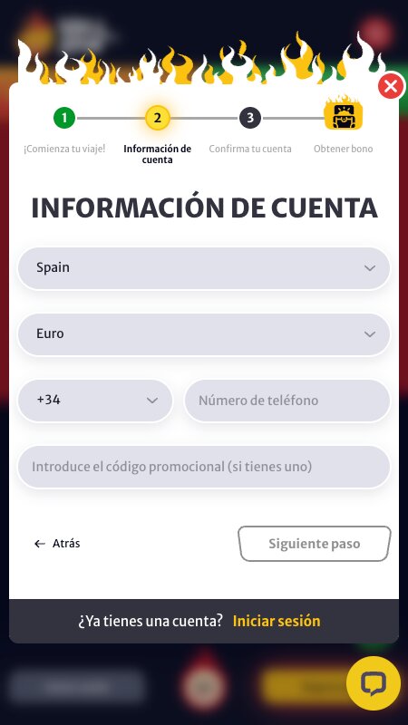 Indica tu país de residencia, la divisa con la que quieres trabajar y escribe tu número de teléfono. También será el momento de introducir un código promocional, si es que tienes uno.