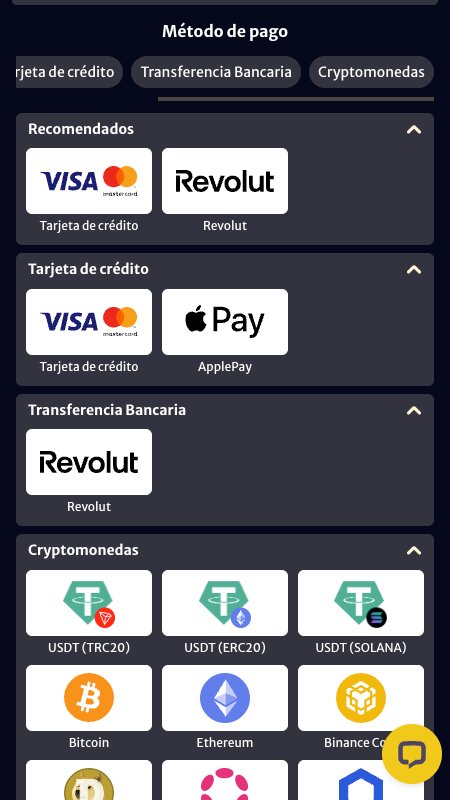 Habrás notado que la página no acepta monederos electrónicos, algo que nos ha sorprendido. Así, a la habitual ausencia de opciones como PayPal o Bizum, hemos de sumar la carencia de opciones para utilizar Skrill o Neteller, dos clásicos en el mundo de los casinos y las casas de apuestas. De todos modos, la cantidad de criptomonedas aceptada suple esta pequeña carencia. Y, de todos modos, siempre queda la opción de recurrir a la tarjeta bancaria o a las transferencias por Revolut.