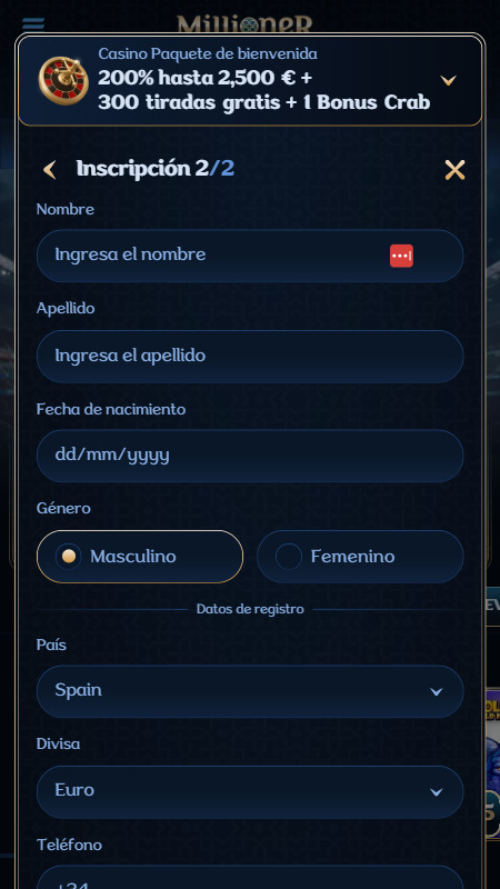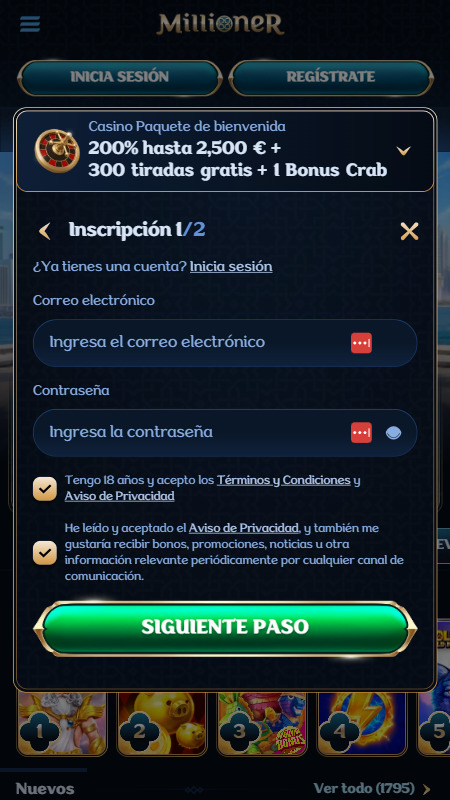 Veamos, a continuación, qué es lo que vas a necesitar para registrarte en Millioner Casa de Apuestas. En realidad, el proceso es bastante sencillo y no te robará mucho tiempo. ¿Los requisitos? Ser mayor de edad, nada más. Sigue estos pasos, y terminarás enseguida: