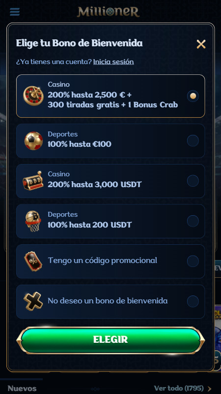 Como puedes ver, en Millioner Casa de Apuestas vas a encontrar dos bonos de bienvenida diferentes. Por un lado, tienes la modalidad normal, que solo acepta un primer depósito en modalidades de pago tradicionales y que te ofrecerá hasta el 100 % de dicho depósito en forma de saldo extra, con un límite de 100 €. Lo mejor es que el rollover es bastante aceptable, y que el depósito mínimo solo será de 20 €.