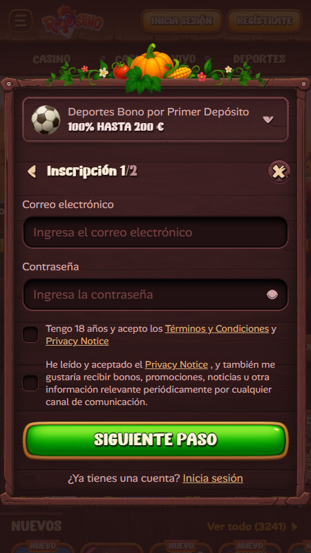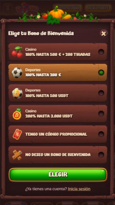 Accede al sitio web oficial y haz clic en el botón de Registro. Aparecerán todos los bonos disponibles (elige el que quieras si quieres).