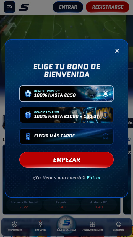 Lo primero que has de hacer es seleccionar la promoción que quieras activar. Puedes elegir el bono de bienvenida o continuar sin él, tú eliges.