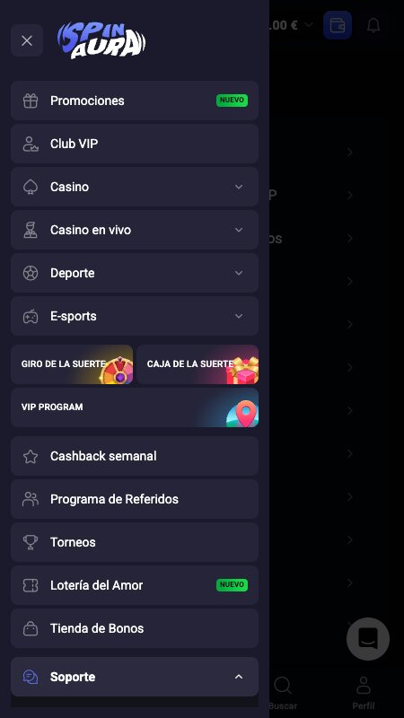 SpinAura es una web muy intuitiva, pone las cosas fáciles desde el principio para que ni “te pierdas” ni tampoco pierdas el tiempo. Puedes encontrar tu perfil y tu saldo en la esquina superior derecha, bien visible desde cualquier sección. La estructura general está organizada en varias columnas que ayudan a navegar cómodamente.