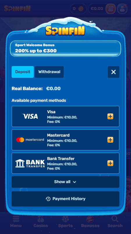 Lo siguiente que vamos a tener en cuenta son los métodos que nos ofrece Spinfin Casa de Apuestas para hacer nuestros depósitos y retiros. Lo que nos interesa, claro está, es disponer de una interesante variedad, que incluya métodos tradicionales y nuevos, pero que todos sean seguros. Y, en este sentido, hemos de decir que la página lo hace bastante bien. Además, hay que añadir un detalle importante: elijas el método que elijas, no tendrás que pagar ninguna comisión.