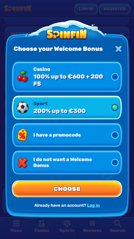 Escoge el bono de bienvenida que te interesa. En este caso, te recomendamos el bono de casino.