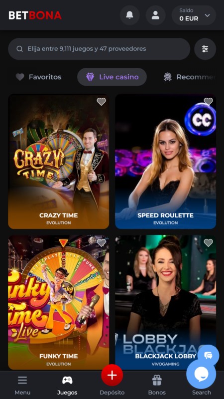 Si lo que buscas es reproducir la emoción de los casinos tradicionales, pero con la comodidad de una página online, entonces lo que necesitas es un casino en vivo. Y, por suerte para ti, Betbona Casino te ofrece una sección dedicada a este tema bastante completa, en la que encontrarás diversos tipos de juego. Así, lejos de tener que conformarte con las mesas de ruleta, también tendrás acceso a juegos como el blackjack, el baccarat o los dados, así como a los super shows. Y, como son juegos desarrollados por proveedores importantes, la calidad estará asegurada.