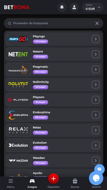 Para poder ofrecer tal variedad de juegos, Betbona recurre a una lista bastante completa de proveedores, con los que ha trabajado sin descanso para que los usuarios de la página tengan todo tipo de opciones a la hora de jugar. Y eso, claro está, es algo bastante positivo y que nos dice muchas cosas de la propia página.
