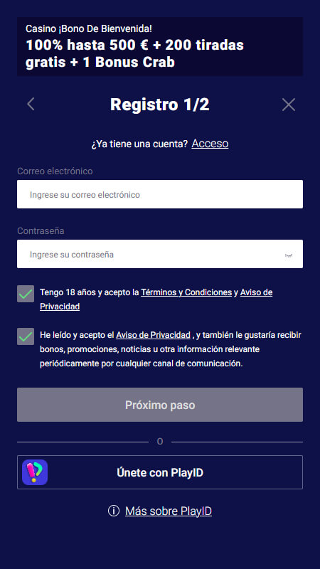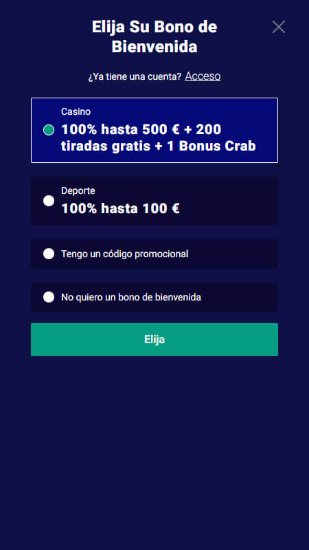 | 🎁 Bono de bienvenida | Hasta 500 € + 200 Tiradas Gratis + 1 Bono Cangrejo |