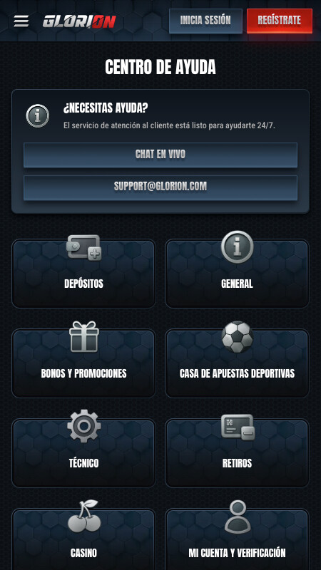 Aunque estamos ante una página que funciona muy bien, hay mil motivos por los que un usuario puede necesitar la ayuda, en algún momento, de un buen servicio de atención al cliente. Y, por eso, nos ha gustado comprobar que el de Glorion Casino es excelente. Su propuesta, construida de forma inteligente, pasa por centralizar todos los servicios relacionados en un único apartado y situar este en una posición destacada en el menú principal. Así, cada vez que necesites ayuda, solo tendrás que visitar su “Centro de Ayuda”.