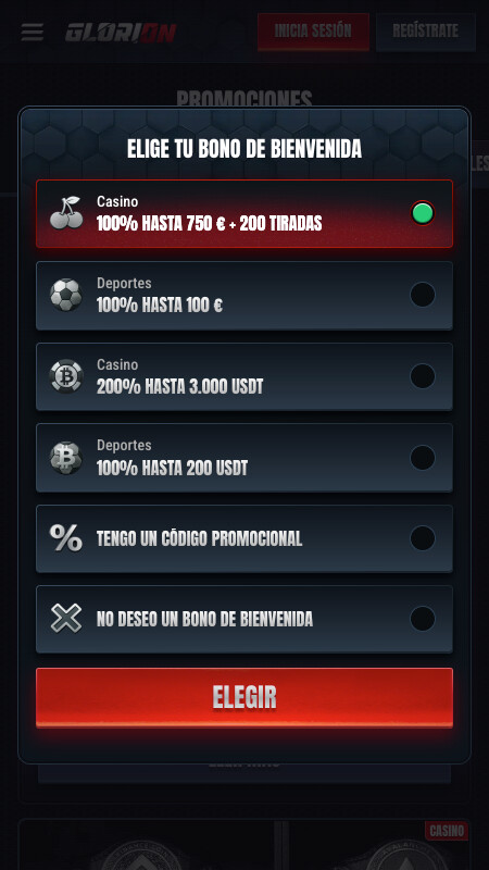 El siguiente punto a analizar será el que concierne a las promociones. Y es que Glorion Casino es una página que quiere premiar a los usuarios que entran por primera vez, pero que no se olvida de los jugadores más fieles. Por eso, presenta un catálogo bastante completo, que se divide en promos para deportes y para casinos y que también ofrece otras promociones especiales de carácter temporal. ¿Y dónde podemos encontrar todo esto? Solo tenemos que acceder a la sección “Promociones”, situada en el menú principal. Esto es, a grandes rasgos, lo que encontrarás allí:
