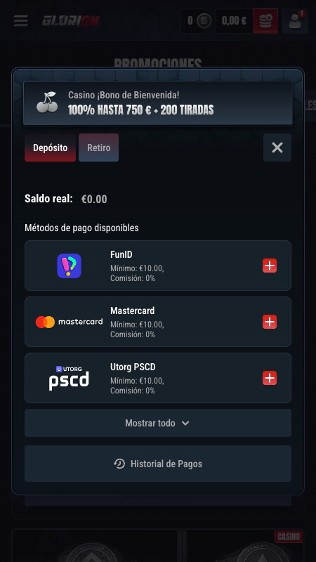Ahora nos vamos a centrar en los métodos de pago disponibles en Glorion Casino. Después de todo, querrás poder hacer depósitos y retiros para jugar en este casino en línea, hacer tus apuestas y retirar tus posibles ganancias. Lo bueno es que, en esta ocasión, dispondrás de una lista bastante variada, en la que hay un poco de todo. ¿Eres de métodos bancarios? ¿O prefieres modernos métodos de pago digitales? Todos están aquí para que los elijas.