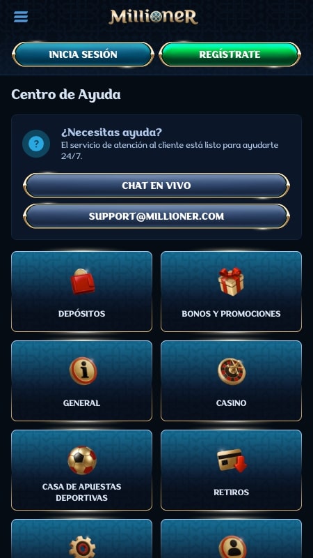 Estamos muy contentos de ver que Millioner Casino cuida de sus usuarios, y eso lo hace a través de un servicio de atención al cliente bastante bueno. ¿Ofrece página de preguntas frecuentes? ¿Atiende mediante chat en vivo? ¿Da algún correo electrónico para contactar de forma externa? La respuesta es sí a todo, y lo logra mediante un único apartado, llamado “Centro de Ayuda”.