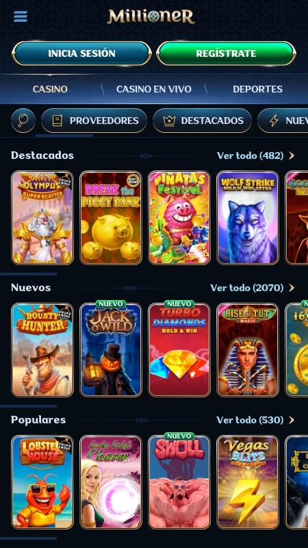 Millioner Casino destaca, entre otras cosas, por contar con una biblioteca de juegos cargada de posibilidades en la que, como usuario, encontrarás todo tipo de opciones lúdicas. Tanto si lo tuyo son las tragaperras, como si te decantas por los juegos de mesa más tradicionales, aquí encontrarás aquello que se ajusta a tus gustos. Además, la presentación es excelente, con subsecciones que facilitan la navegación y un cómodo buscador que te pondrá las cosas muy fáciles.
