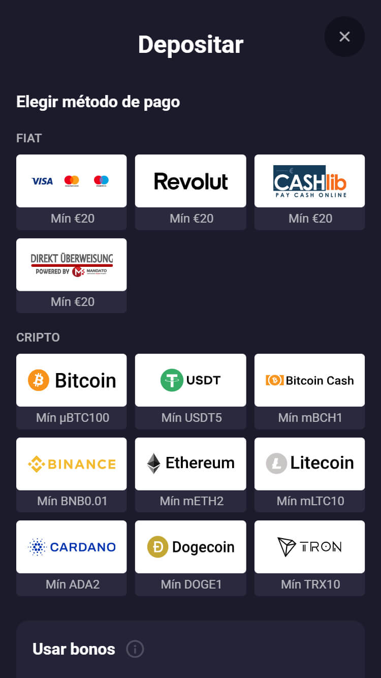 | 💳 Métodos de pago | Visa, MasterCard, Transferencia bancaria, Skrill, Neteller, MiFinity, MuchBetter, Paysafecard, Neosurf, Cashlib, Apple Pay, MB WAY, Bitcoin (BTC), Ethereum (ETH), Litecoin (LTC), Bitcoin Cash (BCH), Dogecoin (DOGE), Tether (USDT), Binance Coin (BNB), Cardano (ADA) y TRON (TRX). |