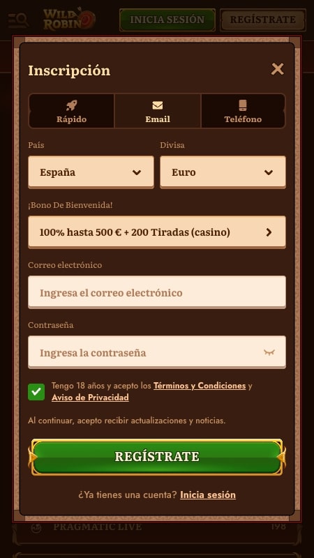 Veamos, a continuación, todo lo que necesitas hacer para registrarte en WildRobin Casino. Como podrás comprobar, es un proceso de lo más sencillo. Eso sí, ya te avisamos ahora de que no debes mentir a la hora de introducir tus datos. Luego te contamos el porqué. De momento, haz lo que te indicamos ahora: