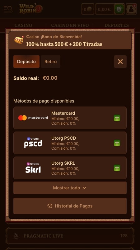 WildRobin nos proporciona muchas opciones para divertiros, pero, claro está, necesitaremos poder hacer nuestros depósitos y nuestros retiros para aprovecharlas. Por eso, ahora vamos a estudiar la lista de métodos de pago aceptados en España. Resaltamos esto último porque, al operar en distintos países, la lista puede cambiar. Así, los que vamos a listar ahora son los métodos aceptados en nuestro país: si juegas desde otro lugar, tal vez cambie un poco.