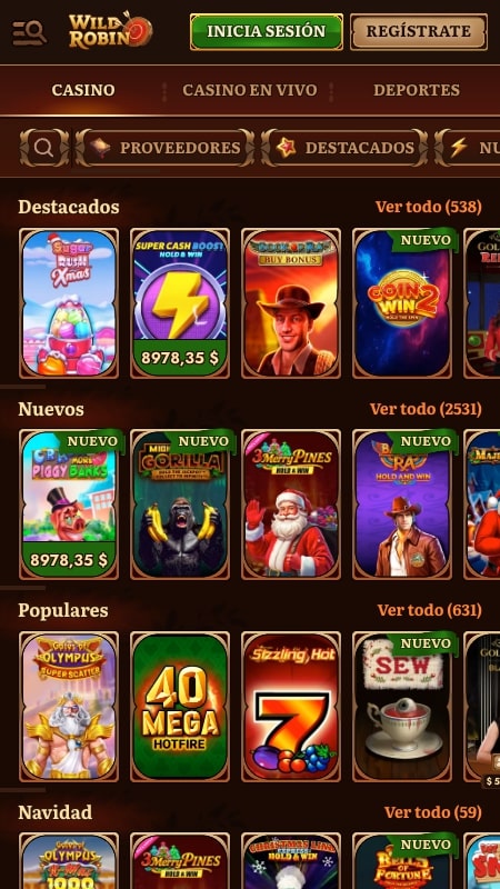 Ahora vamos a ver uno de los puntos fuertes de la página de WildRobin: su biblioteca de juegos. Has de saber que este casino colabora con numerosos proveedores, algo que analizaremos luego con más detalle, y eso ha hecho posible que ofrezca a sus usuarios todo tipo de juegos interesantes. Por supuesto, la sección más poblada será la de tragaperras, pero, además, dispondrás de otras modalidades.
